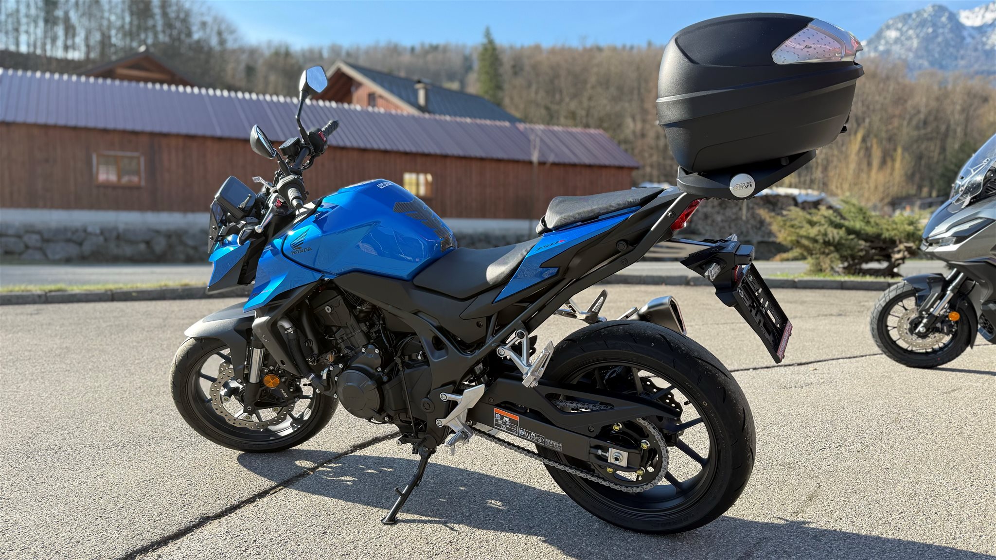 Die Honda ist mit Topcase und Lenkererhöhung von SW-Motech ausgestattet!