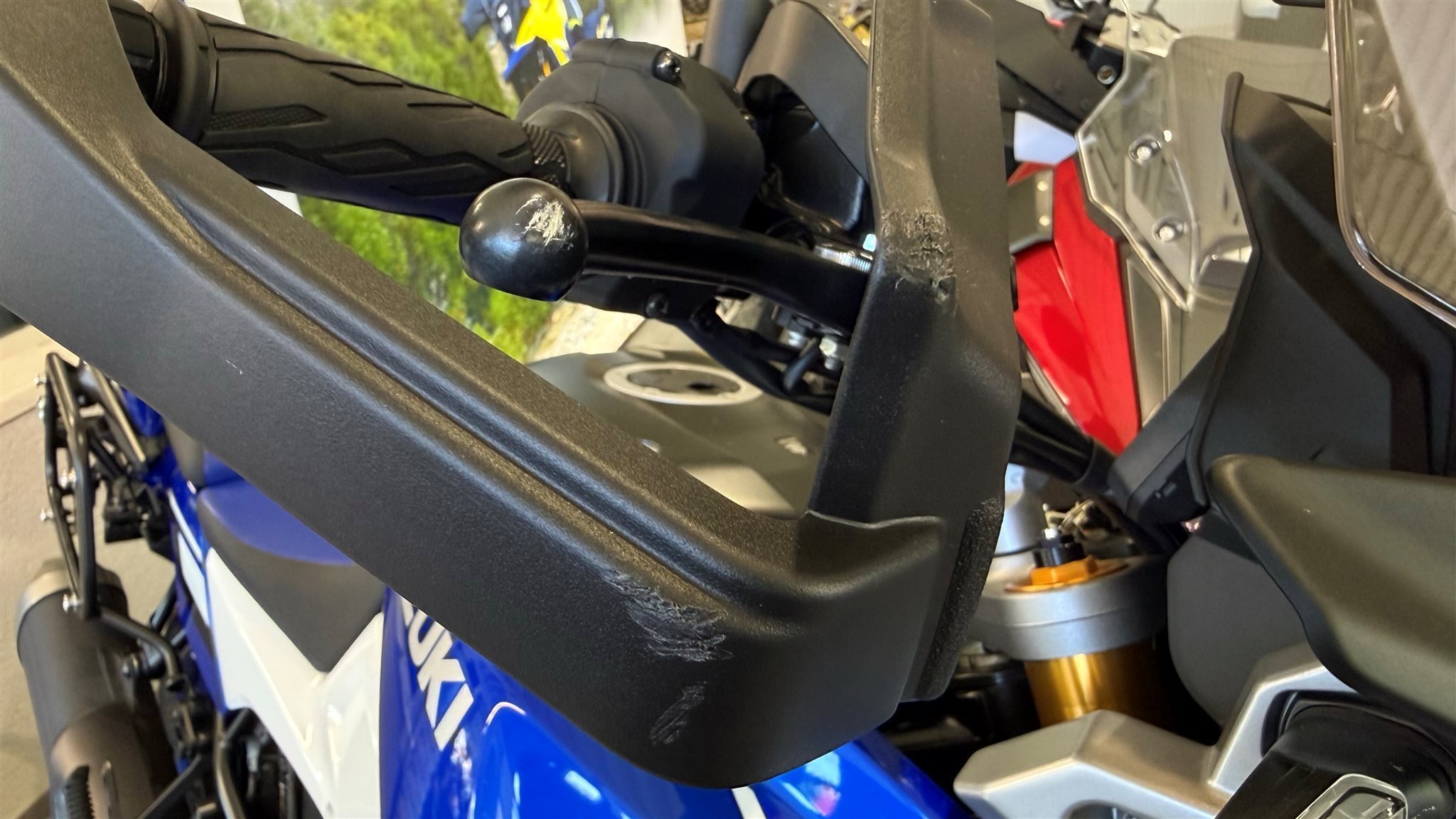 Leichte Kratzer am Spiegel, Handschutz, Lenkergewicht Auspuff siehe Fotos! Fahrzeug ist im Stand umgefallen!